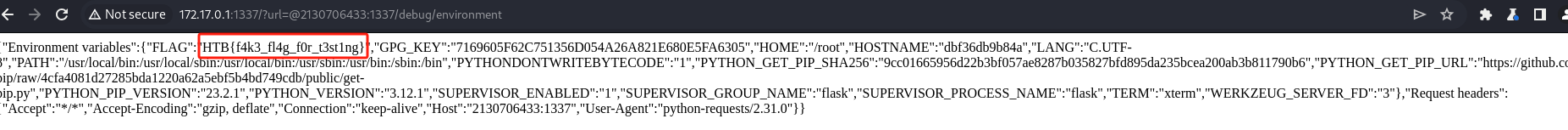 Now the task seems clearer, we have to craft a SSRF attacks, targeted to the /debug/environment and leak the environment settings that contains the flag.